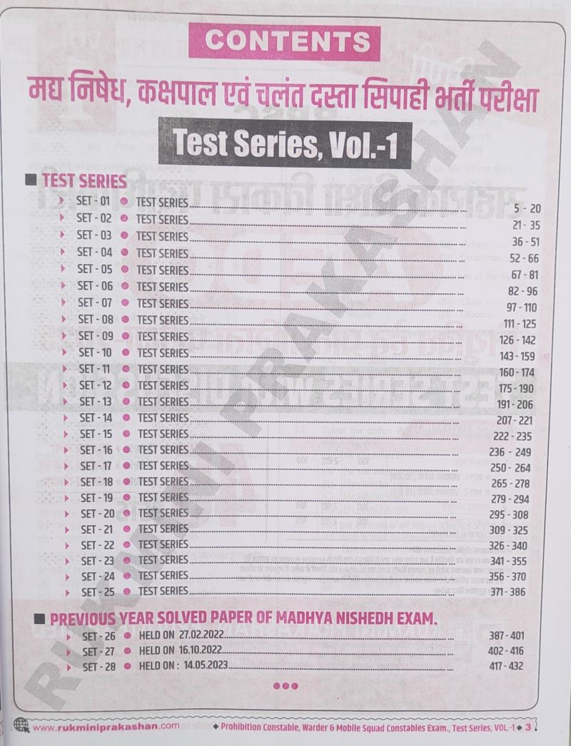 रुकमिणी केंद्रीय चयन पार्षद मद्य निषेध सिपाही, कक्षपाल एवं चलंत दस्ता सिपाही नियुक्ति हेतू भर्ती परीक्षा-2025, 1st संस्करण ,28 सेट (हिन्दी मीडियम)